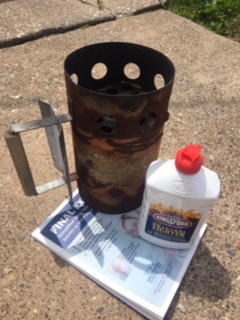 Enter the handy chimney starter. Wadded up newspaper, a splash of lighter fluid on the charcoal (before lighting them) and in less than ten minutes my coals were hot, glowing and ready to pour into my mini fire pit. Done.